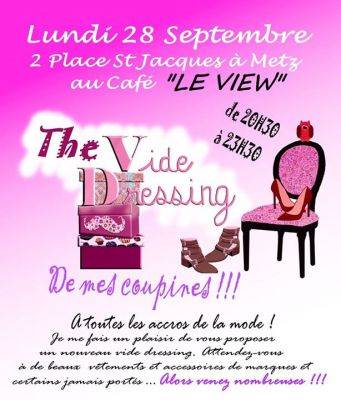 Vous êtes nombreuses à souhaiter des vides dressing, moi comprise. Alors, je me fais un plaisir de vous proposer un nouveau vide dressing. Cette fois-ci, il aura lieu au centre ville de Metz, au café le View, place st Jacques. le lundi 28 septembre , ouvert au public de 20 h 30 à 23 h 30. Attendez vous à de beaux vêtements et accessoires de marques et certains jamais portés.... N’hésitez pas à me contacter en message privé pour celles qui souhaitent vendre.