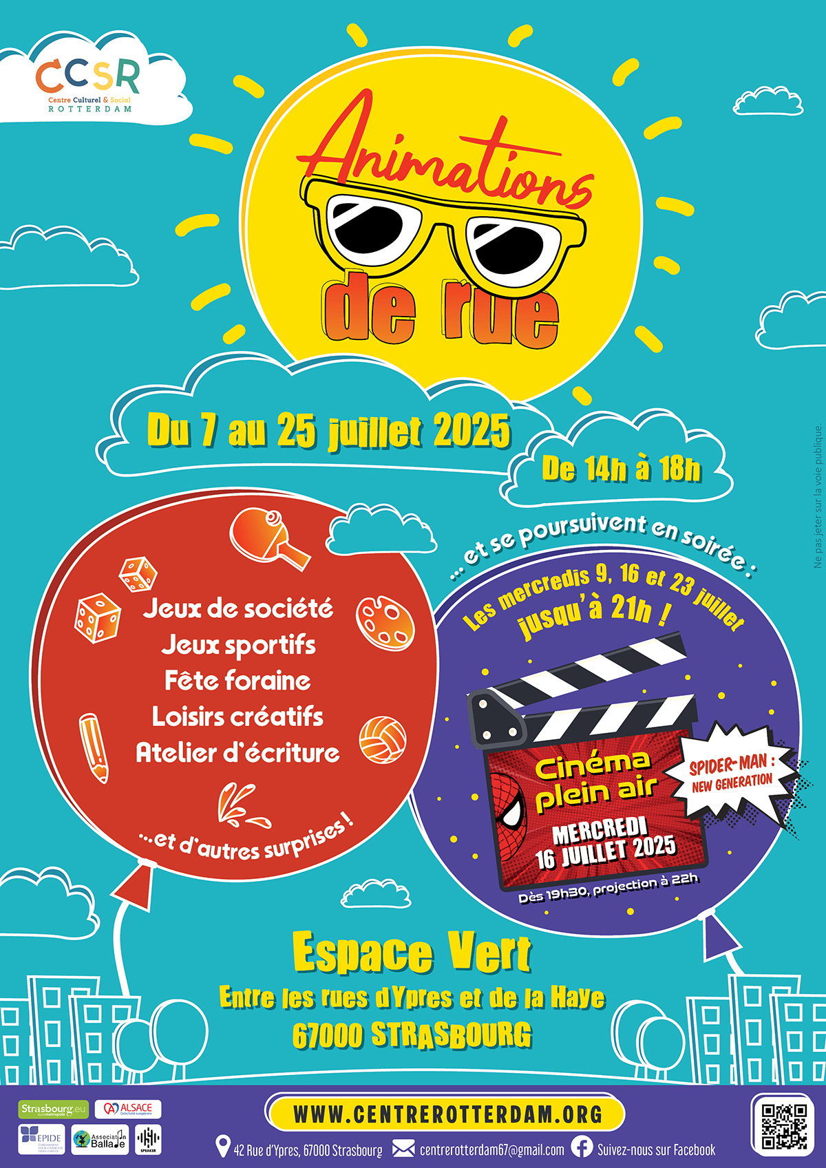 En juillet, vivez l’ambiance festive de la Cité Rotterdam avec des animations de rue en plein air ! Chaque après-midi, venez profiter d’un programme varié : des jeux de société en tous genres, des défis et tournois sportifs, des animations festives dans une ambiance fête foraine, des ateliers créatifs et des bricolages, et bien d’autres surprises animées par notre équipe dynamique et enthousiaste.