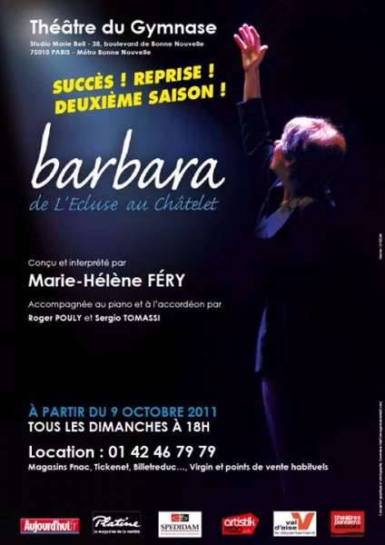 Ce spectacle raconte, en Récits, Chansons et Musique, le parcours de la chanteuse Barbara, et comprend deux périodes principales. La première concerne les dix années pendant lesquelles elle est interprète. Elle chante Brel, Brassens, Scotto..., en particulier au Cabaret de L’Ecluse, célèbre cabaret des quais de Seine, et la seconde se consacre à ses chansons. Un pot-pourri des mélodies des chansons les plus connues de Barbara, effectué par le musicien, relie ces deux parties de son itinéraire artistique.