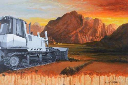 Aujourd’hui, ses préoccupations sont d’ordre écologiques, lui, le citadin qui a quitté Mulhouse dans les années 80 pour s’installer à la campagne à Soppe-le-Haut, au milieu des poules, des lapins et des oies. Parce que « la destruction systématique de la planète» l’insurge, il a commencé à peindre des portraits d’animaux menacés d’extinction à la manière des portraits bourgeois du XIXe siècle : « Dans ces portraits, on a l’impression que ces personnes veulent nous faire passer un message à travers leur regard. Je voulais donner cette même impression avec ces animaux qui ont une réminiscence préhistorique, comme l’éléphant ou le rhinocéros », souligne l’artiste. Il se fait encore plus engagé, à travers sa série sur les écocides, peignant un canard prisonnier dans une pelleteuse ou une biche évacuée par un hélicoptère… L’animal victime de la machine, et donc de l’homme : « Tant que l’homme détruit l’animal ou provoque sa souffrance, l’homme ne peut pas être sauvé, parce qu’il traitera ses semblables de la même façon ». Dans ses dernières toiles, le peindre adoucit son propos : « J’aimerais être un peu plus poétique, taper moins dur. Je ne veux pas être simplement militant, cela me plaît mieux d’être un artiste ». Il y a certes toujours des bulldozers pour détruire la nature, mais dans des paysages inspirés du peintre américain du XIXe siècle, Frederic Edwin Church : « Quand je regarde ces toiles, j’arrive à respirer. Or quand je me balade, je n’arrive plus à respirer, tout est tellement étouffant, surtout en Alsace où tout est morcelé. Tout ce qui défigure le paysage me met en colère. Je n’ai pas de solutions mais je suis persuadé que l’homme doit penser autrement. »