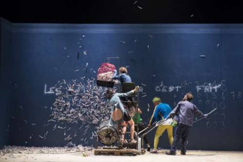 Les transgressions et toutes sortes de fantaisies se multiplient, les folies poétiques et les scandales se bousculent dans une scénographie où tout s’écroule, se défigure et se reconfigure avec un étonnement permanent. Le monde qu’ils reconstruisent galope, hennit, chante par onomatopées, se tache de peinture, éclate et chute à nouveau. Leur terrain de jeu kaléidoscopique, en forme de fête joyeuse et vivifiante, célèbre notre capacité créatrice et nous rappelle que tout est possible. Même rejouer l’ordre du monde aux dés.