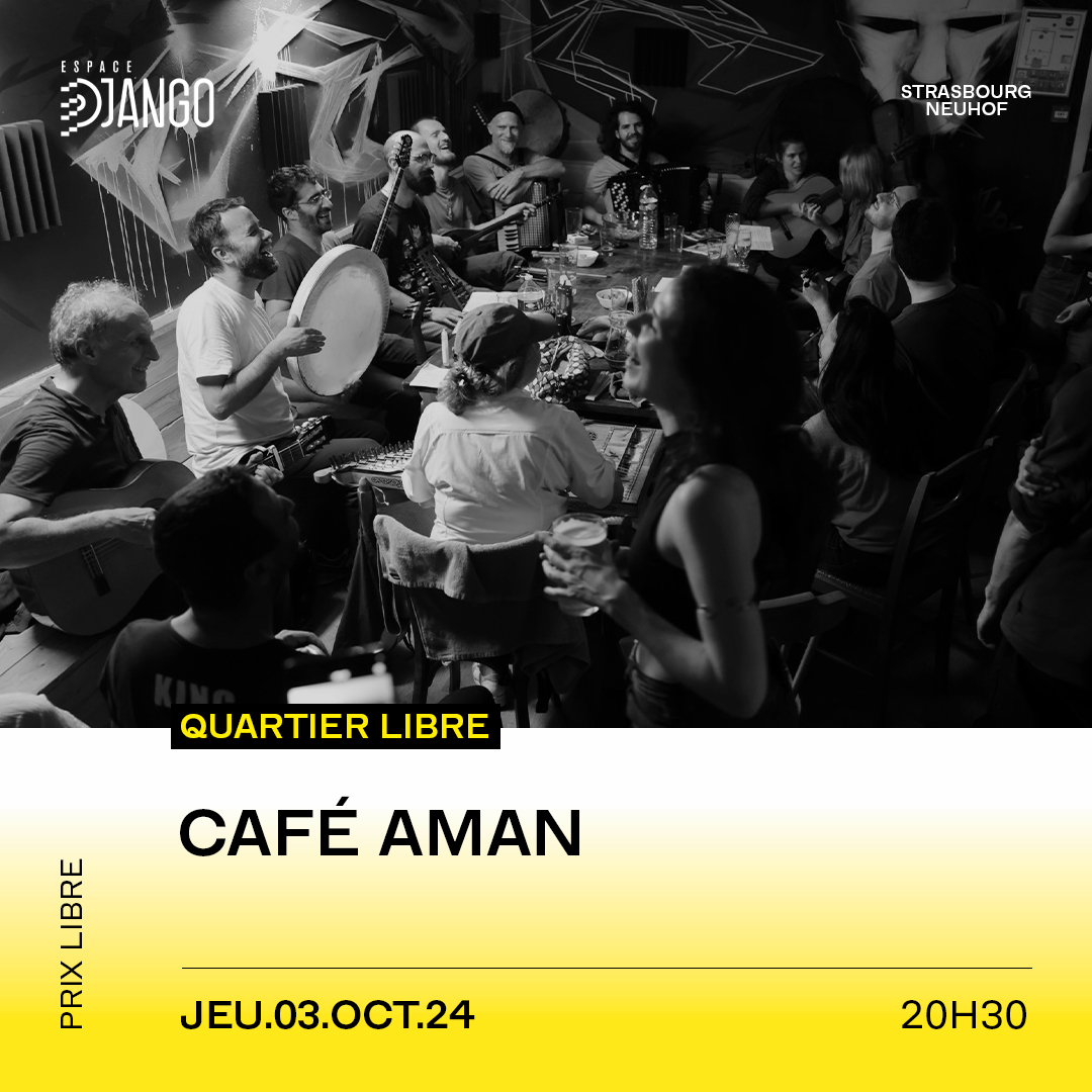 Un nouveau format s’installe à Django : votre salon, au milieu duquel trône une grande tablée de musicien·nes qui frottent, percutent, vibrent ou chantent un répertoire principalement méditerranéen. Le collectif Café Aman s’est installé depuis 2019 dans le paysage strasbourgeois en proposant des jam-sessions autour des musiques de Grèce, de Turquie et du Proche-Orient. Né de l’envie de pratiquer ces musiques dans un cadre convivial, le Café Aman crée un espace où des musicien·nes issu·es de communautés et traditions différentes, partageant un langage musical commun, peuvent se rencontrer de manière informelle en invitant le public à interagir et profiter de la richesse de cette expérience sonore.