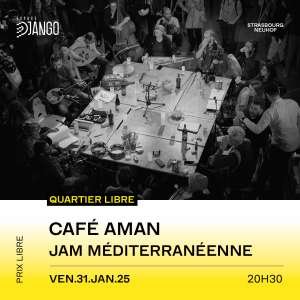 Le collectif Café Aman s’est installé depuis 2019 dans le paysage strasbourgeois en proposant des jam-sessions autour des musiques de Grèce, de Turquie et du Proche-Orient. Né de l’envie de pratiquer ces musiques dans un cadre convivial, le Café Aman crée un espace où des musicien·nes issu·es de communautés et traditions différentes, partageant un langage musical commun, peuvent se rencontrer de manière informelle en invitant le public à interagir et profiter de la richesse de cette expérience sonore.