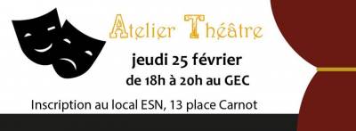 Le club théâtre sera de 18h à 20h, le mercredi 25 février. C’est une activité gratuite mais il n’y a que 15 places. Alors viens vite au local ESN, 13 place carnot, pour t’inscrire.