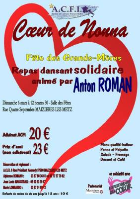L’ACFI vous propose le repas dansant solidaire « Coeur de Nonna » animé par Anton Roman à 12h30, à la salle des fêtes. En partenariat avec la Ville de Maizières-lès-Metz.