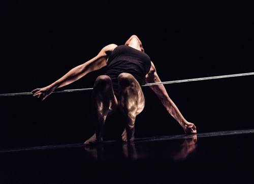 Autour du domaine est un spectacle librement inspiré du recueil Du domaine du poète Guillevic, « une invitation à surveiller l’horizon, à parcourir l’étendue et à scruter la lumière. » Le domaine, c’est le fil. Espace ténu, il n’est ni passé, ni futur, il n’est que présent, instant, et révèle tout mouvement. Autour du domaine est l’effort que l’on déploie pour retrouver un rapport physique au monde, être au plus près de sa fragilité, en parcourir ses aspects fissurés, incomplets, précaires. C’est la recherche d’un équilibre qui n’est pas un idéal, mais un simple cheminement. Il s’agit de traduire physiquement un rapport sensible à cette poésie, à travers les corps sur les fils mais aussi à travers l’image vidéo, la lumière, l’espace sonore. Ce dernier se construit autour de notions de silence, de résonance et sur le traitement de textes enregistrés et diffusés pendant le spectacle. Les sons du domaine participent à l’aventure du poème en donnant des indices aux spectateurs, notamment grâce à l’utilisation de capteurs sonores sur les fils. Ceux-ci donnent à entendre leurs vibrations et rendent perceptibles les hésitations, les prises d’élan et les impulsions des corps sur les cordes tendues. Les fils et les corps qui évoluent sur scène apparaissent d’abord dans des faibles intensités, puis surgissent de la pénombre, pour ensuite s’embraser dans la lumière. Apparaissent alors, sur le fond noir du plateau et parfois sur les corps, des matières subreptices, qui participent à l’évocation du poème. Tout est mis en oeuvre pour que le spectateur soit mis en vibration, comme porté par les fils et puisse s’ouvrir à ses propres sensations.