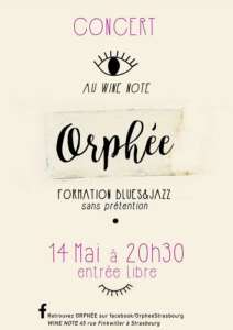 Orphée est un groupe de reprises originales formé en janvier 2015. De Melody Gardot à Cyrille Aimée en passant par Boris Vian, ses musiciens mêlent plusieurs styles, pour le plus grand plaisir de nos oreilles. Ce ne sont pas de simples reprises, mais de véritables ré-appropriations ! Composé d’un batteur, d’un bassiste, d’un guitariste, d’un pianiste et d’une chanteuse, ce groupe saura vous séduire dans une ambiance agréable et Jazzy.