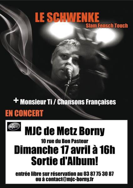 Tout cela donne un premier disque simplement intitulé « Le Schwenke » dont il signe les textes et porte les mots sur des musiques du chanteur messin Monsieur Ti.