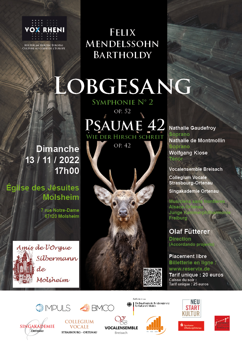 Le Collegium Vocale Strasbourg-Ortenau (CVSO) et ses partenaires d’outre-Rhin, la Singakademie Ortenau (SAO) et le Vocalensemble Breisach (VEB), vous invitent à un concert donné en l’Eglise des Jésuites de Molsheim. Il sera consacré à deux œuvres majeures de Félix Mendelssohn : le psaume 42 ’’Wie der Hirsch schreit’’ et la symphonie n° 2 ’’Lobgesang’’ op. 52. Pour cette occasion, les chœurs seront accompagnés par l’orchestre ’’Musiciens sans frontières’’ et des musiciens de la ’’Junge Kammerphilharmonie Freiburg’’. La direction sera assurée par leur chef, Olaf Fütterer.