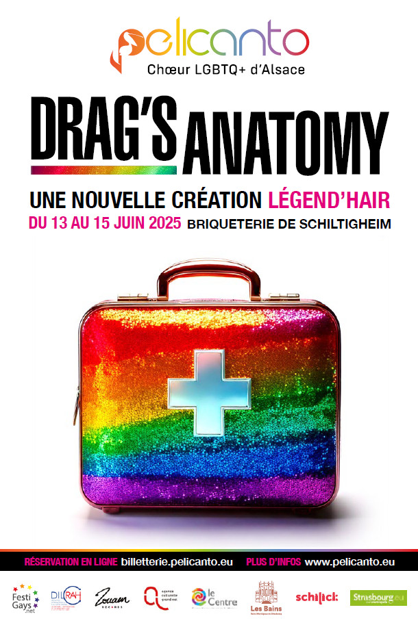 Dans cette nouvelle comédie, Pelicanto revient à la Briqueterie de Schiltigheim avec une histoire inédite, son répertoire pop inimitable et son chœur vibrant de 45 choristes plus soudé·e·s que jamais. Contre les inégalités et les fachos de tous bords, Drag’s Anatomy est une ode à toutes celles et ceux qui, chaque jour, prennent soin des autres et des plus vulnérables d’entre nous.