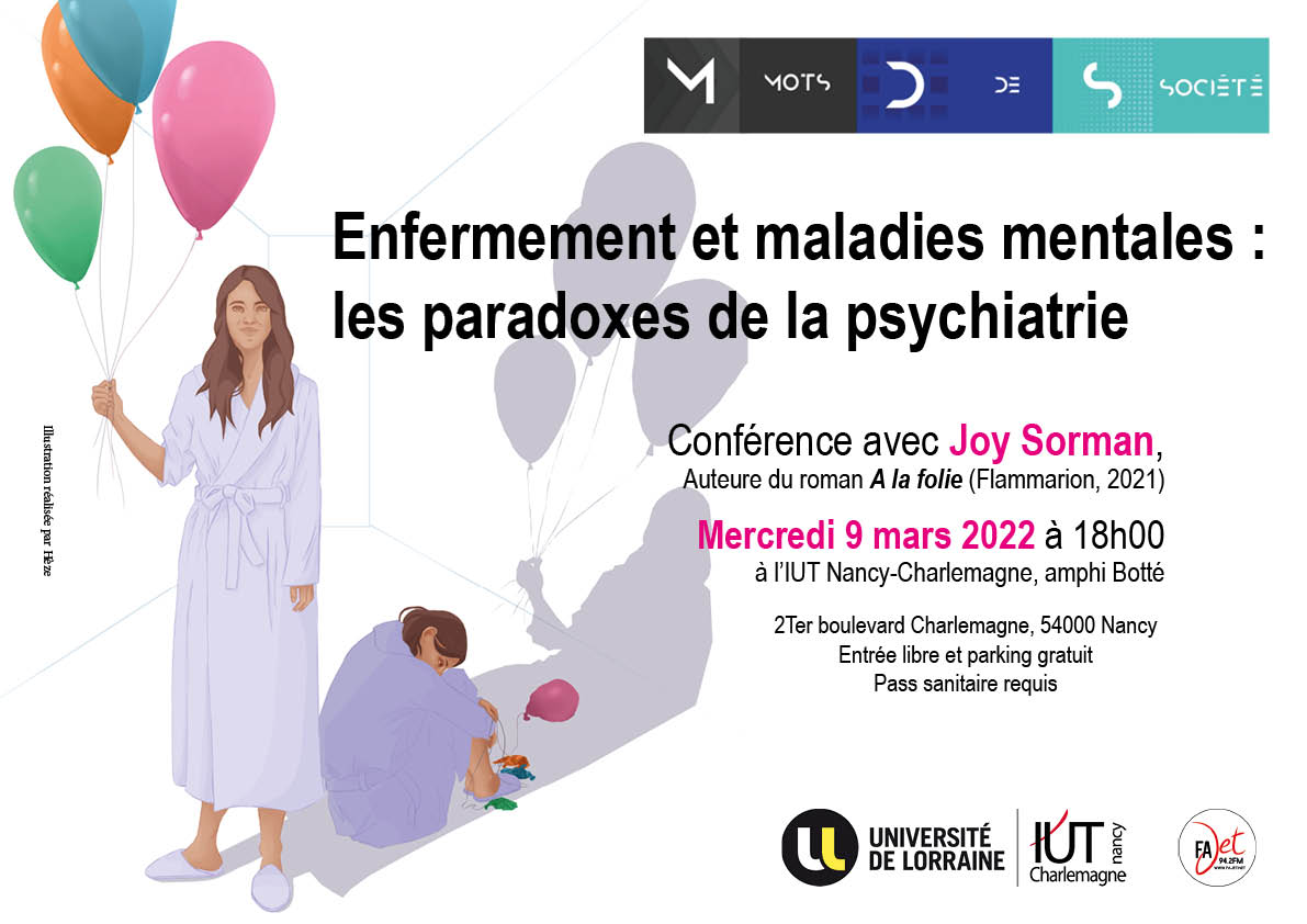 A l’occasion de la dernière conférence de la saison 2021-2022, nous vous donnons rendez-vous mercredi 9 mars à 18h00 en amphi Botté. Dans le cadre du cycle Mots de Société : « Enferment et maladies mentales : les paradoxes de la psychiatrie », nous accueillons Joy Sorman, auteure du roman A la folie paru chez Flammarion en 2021.
