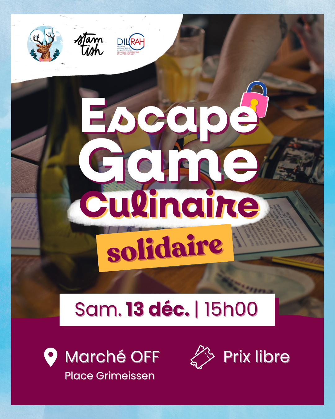 🎟️ L'achat d'une place comprend : le jeu d’une durée d’1h suivi d’un goûter (encas et boisson), concocté pour l'occasion par un·e cuisinier·e de la brigade issu·e des migrations💰 Afin d'ouvrir nos événements au plus grand nombre, nous souhaitions que chacun·e puisse donner à hauteur des ses moyens par le biais d'un prix libre. Afin de vous éclairer sur les coûts qui se cachent derrière l'organisation d'un Escape Game culinaire, voici quelques informations qui vous aiguilleront sur les paliers de financement pour chaque somme versée.