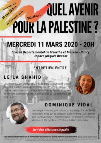 Alors qu’elle est maintenant retraitée au Liban, Leila Shahid a accepté de revenir à Nancy le mercredi 11 mars prochain pour donner une conférence en compagnie de Dominique Vidal au Conseil Départemental à Nancy à 20 h. Cette conférence s’inscrit dans le cadre du festival du Printemps de la Palestine qui aura lieu du 7 au 22 mars et est organisé par 10 associations.
