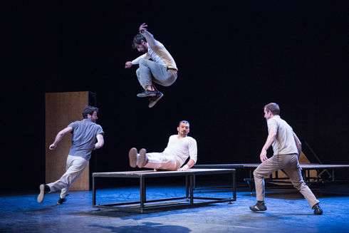 Un trampoline, une bascule et quatre hommes… Quatre acrobates qui s’observent, se jaugent, se cognent, se portent, se lancent et nous transportent dans leur farandole métaphorique : les rencontres, les rivalités, les exploits, les ratages, les prises de pouvoir, la séduction, les manipulations, un « intarsio » (en italien, pièce de marqueterie) fait de fragments de vie, un aperçu du caléidoscope des relations humaines.