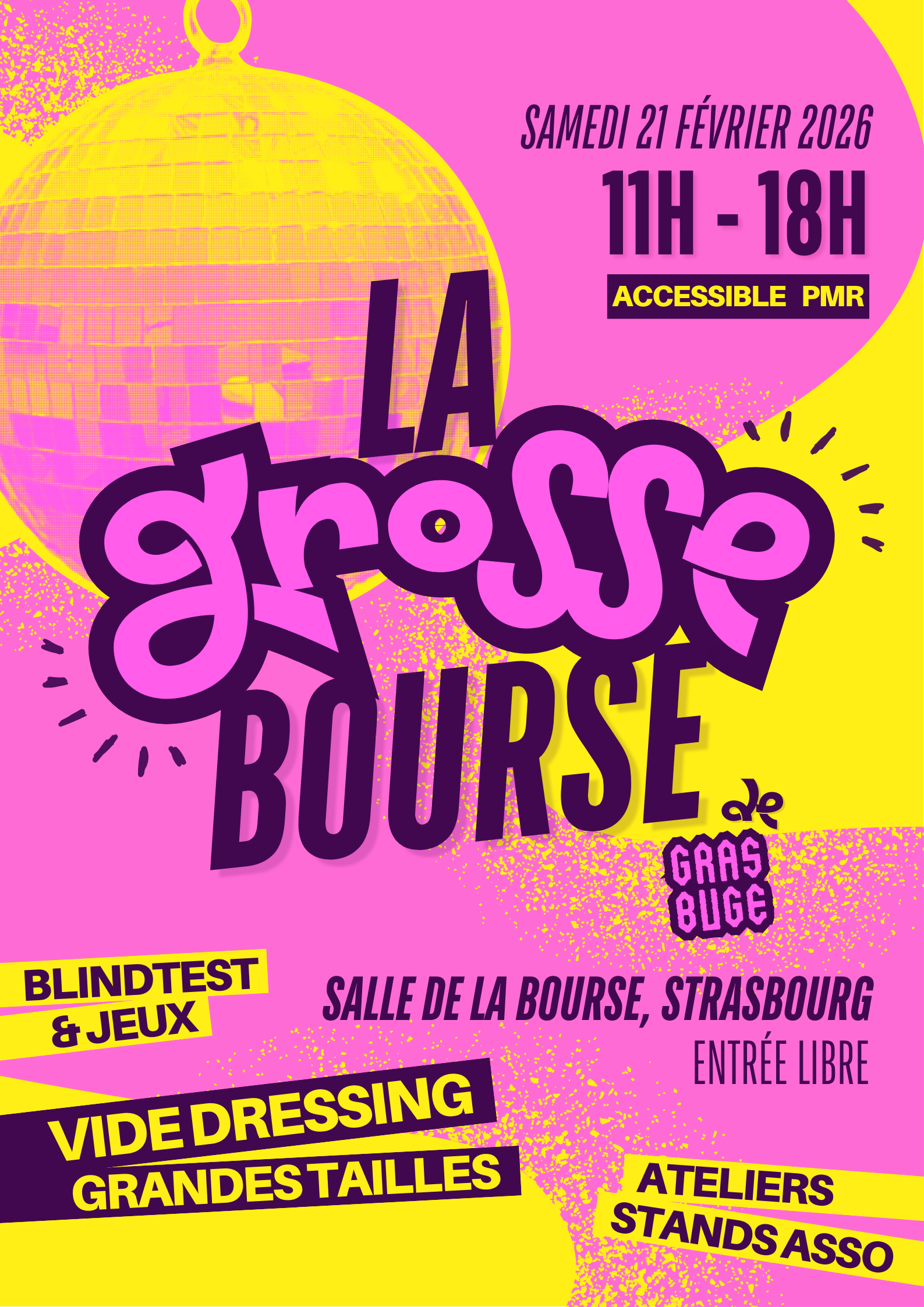 L’association GRASbuge organise le 21 février prochain, de 11h à 18h, un grand vide-dressing grande taille, accompagné d’une journée festive, solidaire et ouverte à toutes et tous. L’événement se tiendra à la Salle de la Bourse à Strasbourg, et a pour ambition de créer un espace convivial et bienveillant et de célébration des corps dans toute leur diversité. Pensé comme un moment de rencontre, de partage et de sensibilisation, cet événement s’adresse aux personnes concernées comme aux allié·es, dans une atmosphère chaleureuse et accessible.