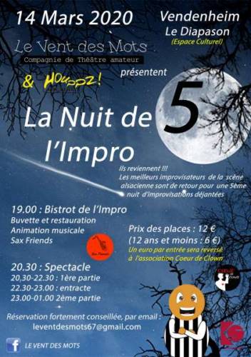 La compagnie de théâtre d’improvisation « Le Vent Des Mots » et « Houppz Théâtre » reviennent pour la cinquième édition de la Nuit de l’Impro le 14 Mars 2020 !!!