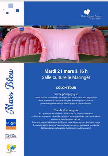 Guidés par deux infirmières de la Clinique Louis Pasteur, il est proposé au public de visiter l'intérieur d'un côlon gonflable géant d'une longueur de 12 mètres pour mieux appréhender les différents stades du cancer colorectal. La Ligue contre le Cancer et le CRCDC Grand Est seront présents pour expliquer les programmes mis en place au niveau national pour lutter contre cette maladie. Il sera possible également de découvrir l'ensemble du parcours de prise en charge des patients atteints du cancer colorectal en rencontrant des membres de notre équipe d'endoscopie (stomathérapeute, diététicienne, psychologue, etc.)