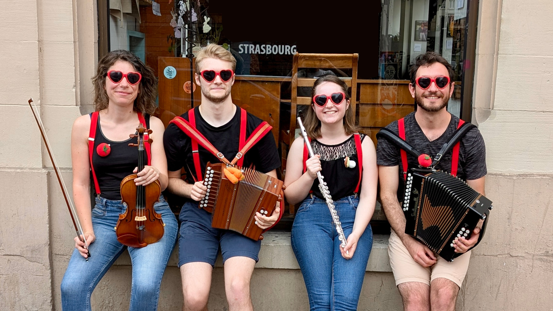 BIS BAL'D est un groupe de 4 amis musiciens aux bretelles rouges qui se sont rassemblés autour d'une passion commune pour la musique & la danse folk dans un esprit de convivialité ! Le groupe est constitué de Quentin et Romain à l'accordéon diatonique, Caroline à la flûte traversière et Édith au violon.