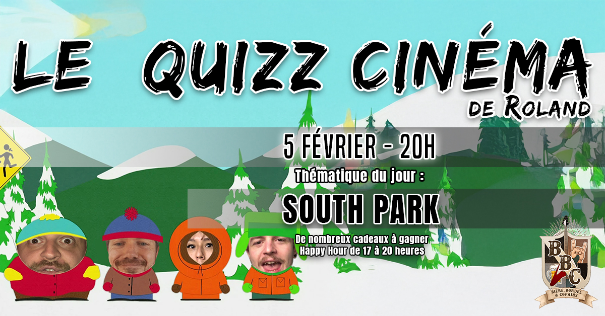 ?? Le mercredi 5 février à 20 heures, le BBC vous invite à une soirée ciné-quiz totalement déjantée avec un thème qui va faire parler : South Park ! Préparez-vous à plonger dans l’univers irrévérencieux de la petite ville du Colorado où tout peut arriver… et surtout le pire !