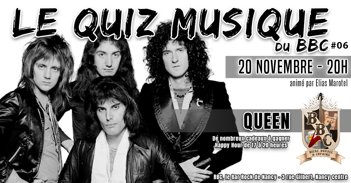 ⚡ Jeudi 20 novembre à 20h, le BBC t’ouvre les portes du royaume de Freddie Mercury et de ses complices. Prépare-toi à au moins 15 questions sur un groupe qui a transformé les stades en chorales géantes et les moustaches en accessoires de légende.