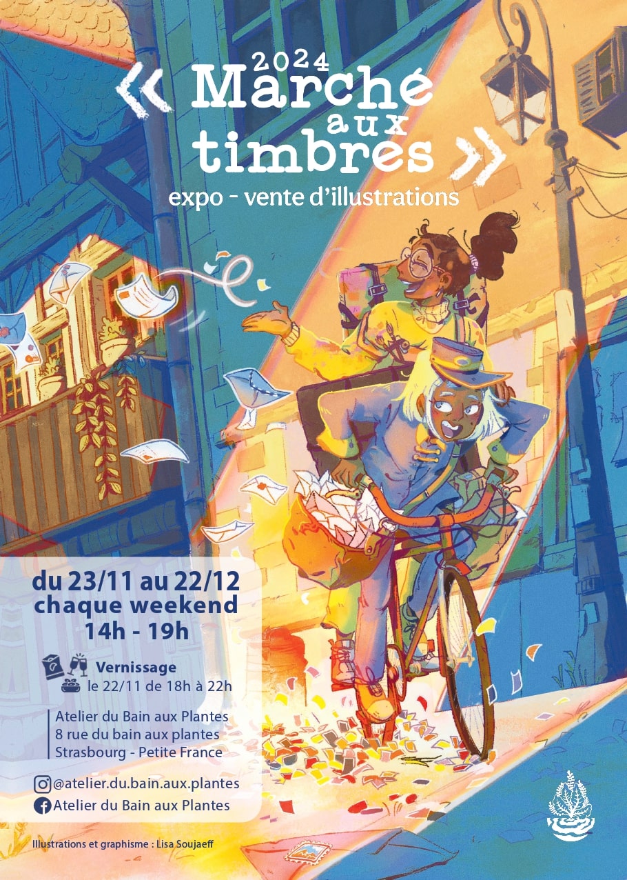 Sur le thème "Marché aux timbres", la nouvelle exposition de l’atelier du bain aux plantes sera visible du 23 novembre au 22 décembre 2024 de 14 heures à 19 heures. Vernissage de l’exposition le 22 novembre de 18 heures à 22 heures.