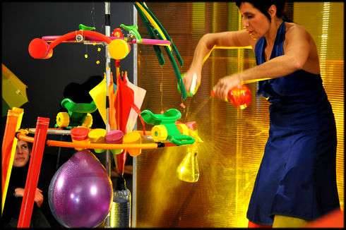 Par devant, par-dessus, une pluie se forme autour des enfants blottis dans les bras des grands. Nées du silence et du vent, les gouttes tombent jusqu’à l’orage, qui doucement se calme et le soleil revient. Dans la salle où les petits sont accueillis en musique, la voix virevolte. Tout est source d’étonnement, les fontaines, les instruments de musique, la couleur des ballons, la brume qui vient mouiller le bout du nez. L’eau donne envie de barboter et la musique emporte vers une originale première expérience de théâtre.