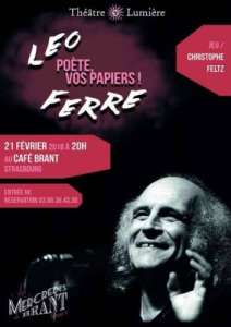 La Compagnie Théâtre Lumière vous invite à découvrir la lecture-spectacle ’Poète, vos papiers !’ d’après les textes des chansons de Léo Ferré, Mercredi 21 février 2018, 20h, au Café Brant à Strasbourg.