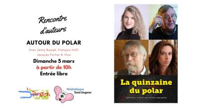 Rencontre avec des invités de marque pour échanger autour du polar : Jenny Bussek - traductrice, Vlou - illustratrice des "enquêtes rhénanes", François Hoff - historien du roman policier, écrivain, directeur de la revue d’études Holmésienne le Carnet d'écrou, et Jacques Fortier - auteur de romans policiers.