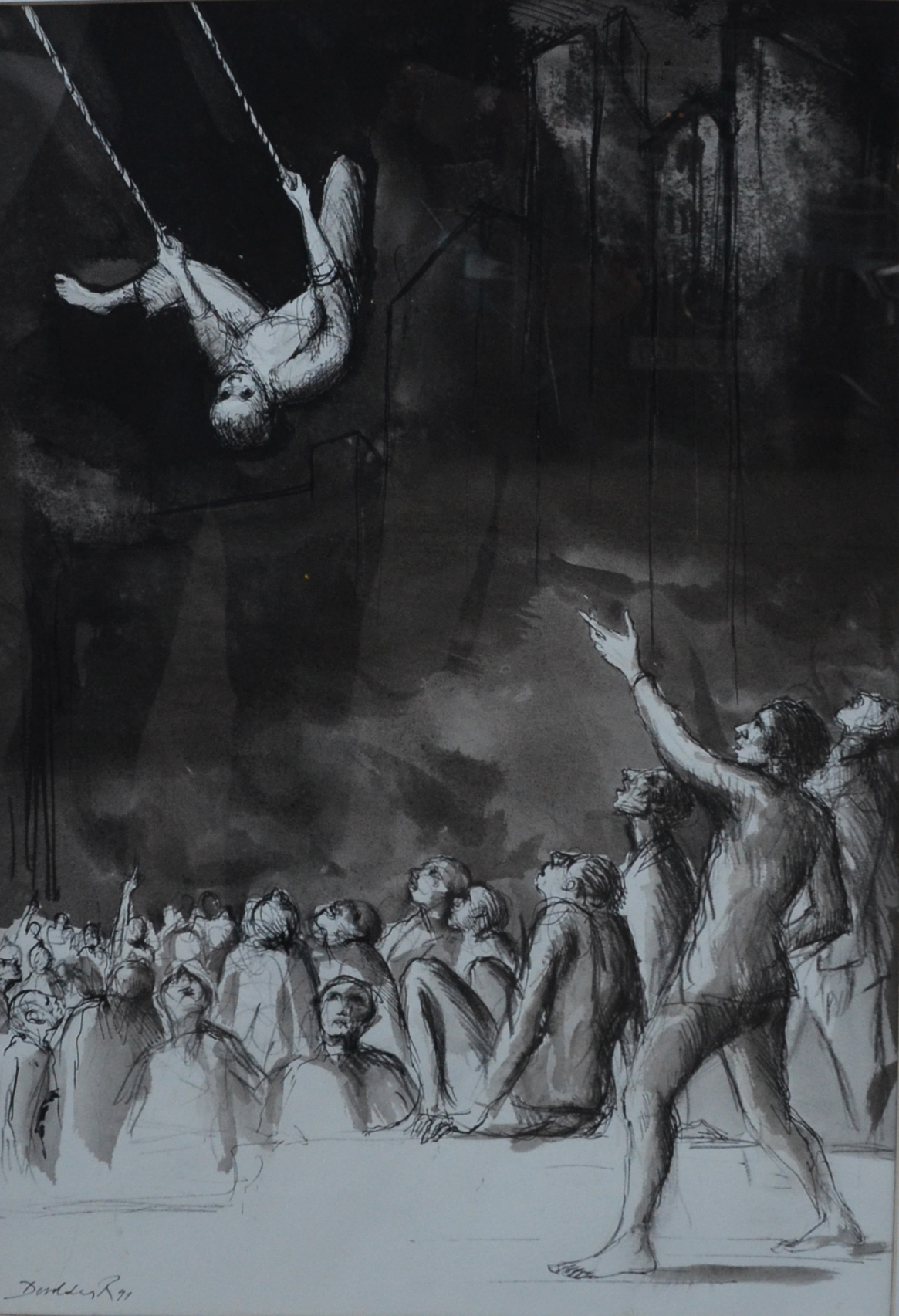 Roland Devolder est né en 1938 à Ostende, une ville qui imprègne sa peinture. Il y a respiré le même air qu’Ensor et Spilliaert, et l’on peut dire qu’il compte lui aussi parmi les grands inspirés de cette ville fantasque. Héritier de l’école réaliste flamande, Roland Devolder perpétue en renouvelant la tradition de dérision et de folie en mineur qui est depuis des siècles une source d’inspiration constante de la peinture flamande, il en partage l’inquiétude existentielle ou le goût pour l’ombre. Mais à cette noirceur répondent toujours un fil de lumière et quelques éléments symboliques. Au point que ses huiles et ses dessins à l’encre semblent avant tout exprimer la multiplicité des états et des émotions qui les accompagnent. Rêve et réel s’entremêlent, immobilisme et mouvement se chevauchent, espoir et implacabilité se complètent.