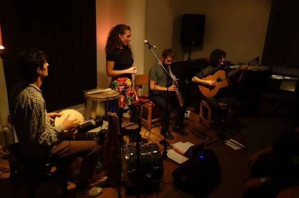 est un quartet né a? Bruxelles en février 2017 par la rencontre de Stéphanie Scultore (chant, écriture, compositions); Matteo Carola (guitare, cavaquinho, chant, compositions); Mathieu Robert (saxophone soprano) et Falk Schrauwen (percussions).Nous nous sommes réunis autour de la poésie et la musique brésilienne. La richesse harmonique, rythmique et les textes magnifiques qu’elle convoie étaient le parfait point d’accroche pour nos différents univers (musiques du monde, chanson française, jazz).