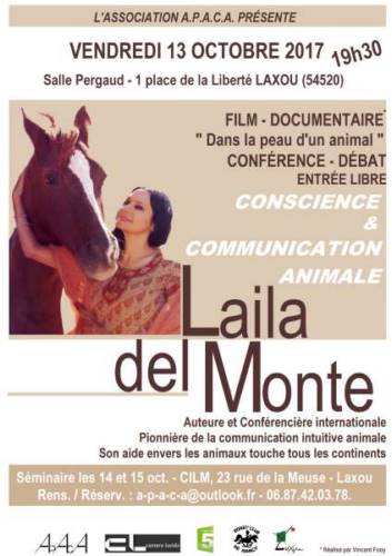 Nous avons l’immense plaisir de vous annoncer la venue de LAILA DEL MONTE (américaine spécialiste et professionnelle en communication intuitive animale) à Laxou les 13-14-15 OCTOBRE 2017