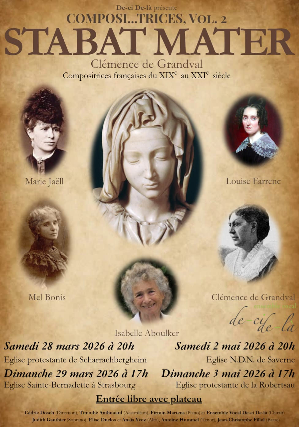 Après un premier programme dédié aux composi...trices en 2024 puis une représentation du Dixit Dominus de Marianna Martines (contemporaine de Mozart) en 2025, l'ensemble vocal De-ci De-là espère une fois encore aider à désinvisibiliser ces femmes compositrices injustement méconnues.
