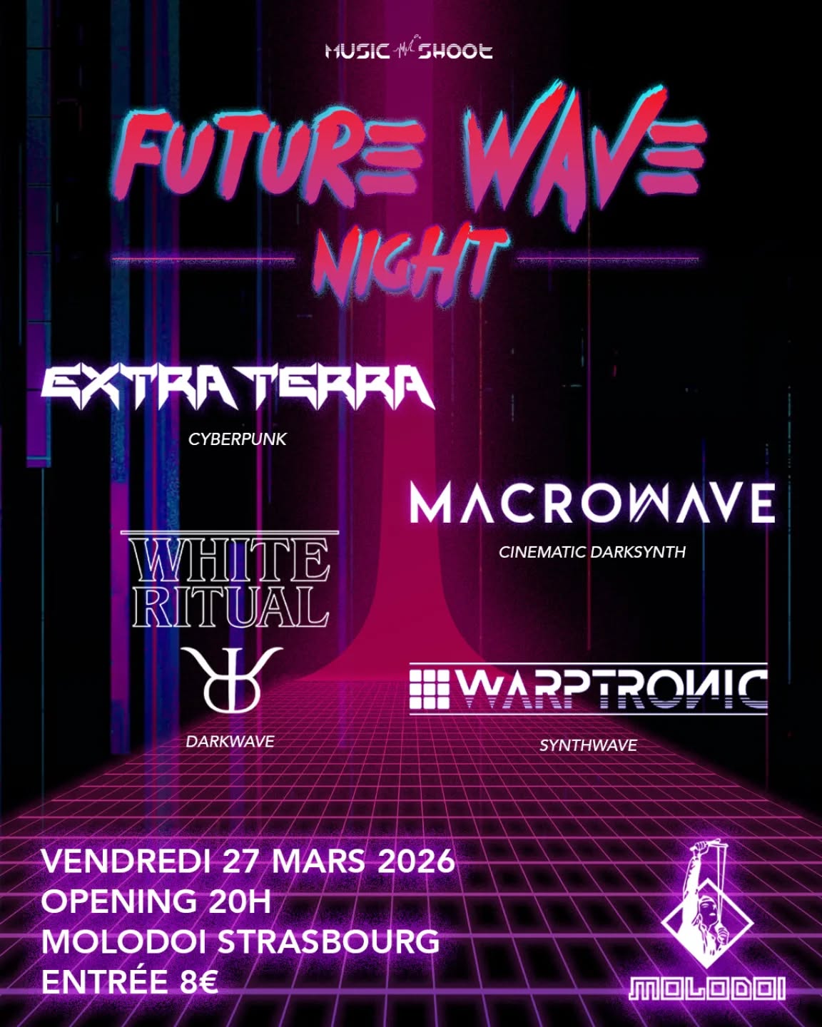 Pour célébrer le retour du printemps, Music Shoot présente: Future Wave Night ! Venez découvrir Extraterra, Macrowave, Whiteritual et Warptronic dans une ambiance entre cyberpunk et 80's.
