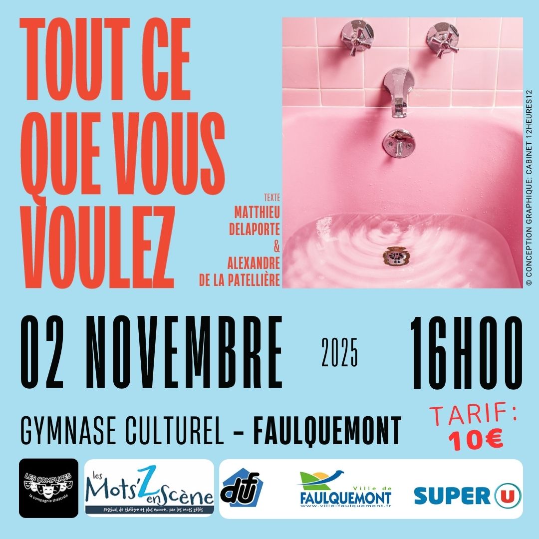 TOUT CE QUE VOUS VOULEZ Une comédie d'Alexandre De La Patellière & Matthieu Delaporte (les auteurs de la pièce "LE PRÉNOM") Par la Troupe LES COMPLICES la compagnie théâtrale Mise en scène par Jean-Marc Bechler Avec Aurélie Gratet-Bordas & Fabien Médina RÉSUMÉ : Lucie, dramaturge talentueuse, est en proie à une crise de la page blanche alors que la première de sa pièce approche. L'arrivée de Thomas, son nouveau voisin sympathique, mais très envahissant, bouleverse son quotidien. Leurs échanges sont drôles et émouvants, mais une question taraude Lucie : Va-t-elle retrouver son inspiration avant la première ? TOUT CE QUE VOUS VOULEZ Dimanche 02 Novembre 2025 16h00 90 min Gymnase Culturel du Bas Steinbesch 16 Rue de la Nied, 57380 Faulquemont TARIF : adulte = 10 € -16ans = 6 € RÉSERVATIONS : https://www.helloasso.com/associations/les-mots-zeles/evenements/tout-ce-que-vous-voulez-cie-les-complices-faulquemont-02-11-25-16h00 RENSEIGNEMENTS : https://www.helloasso.com/associations/les-mots-zeles Merci beaucoup à la compagnie Les Mots Zélés de nous convier à jouer à leur Festival Les Mots Z En Scène. Nous espérons vous voir nombreux ! Vive le théâtre amateur ! LES COMPLICES la compagnie théâtrale est une troupe de théâtre amateur d'Ennery en Moselle et adhérente à la Fédération Nationale des Compagnies de Théâtre Amateur. https://linktr.ee/LesComplicesCie