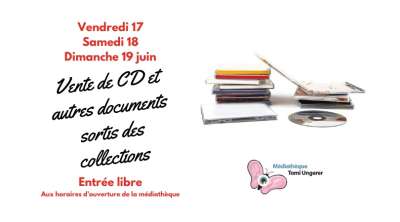 La médiathèque se sépare de certains documents déclassés des collections. Retrouvez de nombreux CD de tous styles, ainsi que des beaux livres et quelques bandes-dessinées...