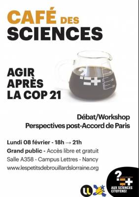 Lundi 08 février, de 17h45 à 21h, l’association des Petits Débrouillards de Nancy et Axit Ecologie (association d’élèves de Sciences Politiques Nancy) organisent un atelier de travail autour des décisions prises lors de la COP21, et des perspectives ouvertes dans les années à venir pour une transition durable. La rencontre se déroulera sur le Campus Lettres et Sciences Humaines, en salle A358.
