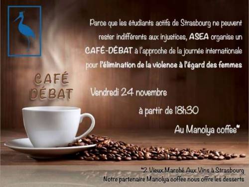 À l’occasion de la journée internationale pour l’élimination de la violence à l’égard des femmes, ASEA a décidé de réunir ses étudiants actifs autour d’un café pour réfléchir, se questionner, débattre autour de la question, et même proposer un projet pour éliminer définitivement toute forme de violence à l’égard des femmes.