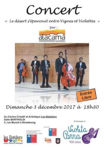 Cet ensemble est né le 2017 ayant la vision de promouvoir la musique de chambre dans la région d’Atacama, CHILI. Il est intégré par des jeunes interprètes classiques qui sont intéressés en la diffusion de la musique de compositeurs chiliennes et latino-américains. Actuellement, le Quintette Atacama travaille autour l’oeuvre de Violeta PARRA, musicienne et artiste chilienne à qui nous commémorons le centenaire de sa naissance. Pour son projet Le désert s’épanouit entre Vignes et Violettes, ils ont obtenu un financement par le gouvernement de la Région d’Atacama grâce auquel ils feraient une tournée en Europe où ils rendent hommage à cette musicienne.