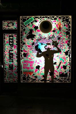 La Factorine vous invite au DERnissage de la vitrine de Nicolas Lachambre, dernière occasion pour voir son installation de découpages lumineux formant un grand vitrail sur toute la surface de la vitirne.