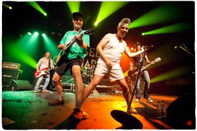 Joueur d’épuisette façon air guitar, casquette, marcel et short qui baille (qu’il ote au fil du set pour un slip kangourou ...), chaussettes aux couleurs du FC Nantes, l’impérial Manou, au chant, pilote ce combo rock dans lequel surfent Kalou (bassiste aux improbables chemises colorées), Vincent (batteur à la bonne humeur contagieuse), Twistos (guitariste aux éternels bermudas) et Grand Lolo (Guitar héros légendaire et tatoué, tout droit venu de Los Angeles), celui-ci ayant remplacé l’historique Kelu.