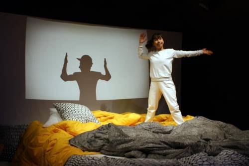 Une lumière douce, un immense lit, des couvertures et des oreillers partout. Une fois le public installé confortablement sous la couette avec les comédiens, l’histoire peut commencer.