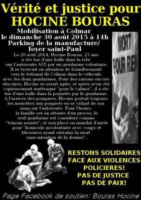 Le 26/08/2015 ça fera 1 an qu’Hocine Bouras a perdu la vie sur l’A35 tué menotté d’une balle dans la tête par un gendarme volontaire. Réunissons nous tous pour sa mémoire et que justice sa faites. Il est "mort pour rien", cette marche se fera dans le respect et la dignité pour soutenir sa famille et aussi pour plus que ça se reproduise. Venez nombreux et Partagez!!!