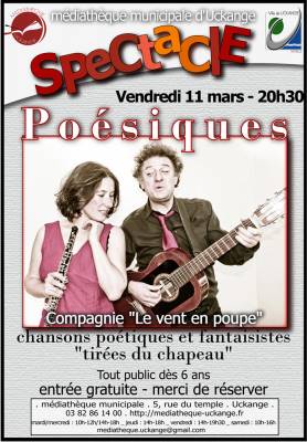 Avec leurs chansons poétiques tirées du chapeau, Virginie et Dominique de la Cie le Vent en Poupe donneront au heureux hasard la responsabilité de définir le programme de leur spectacle.