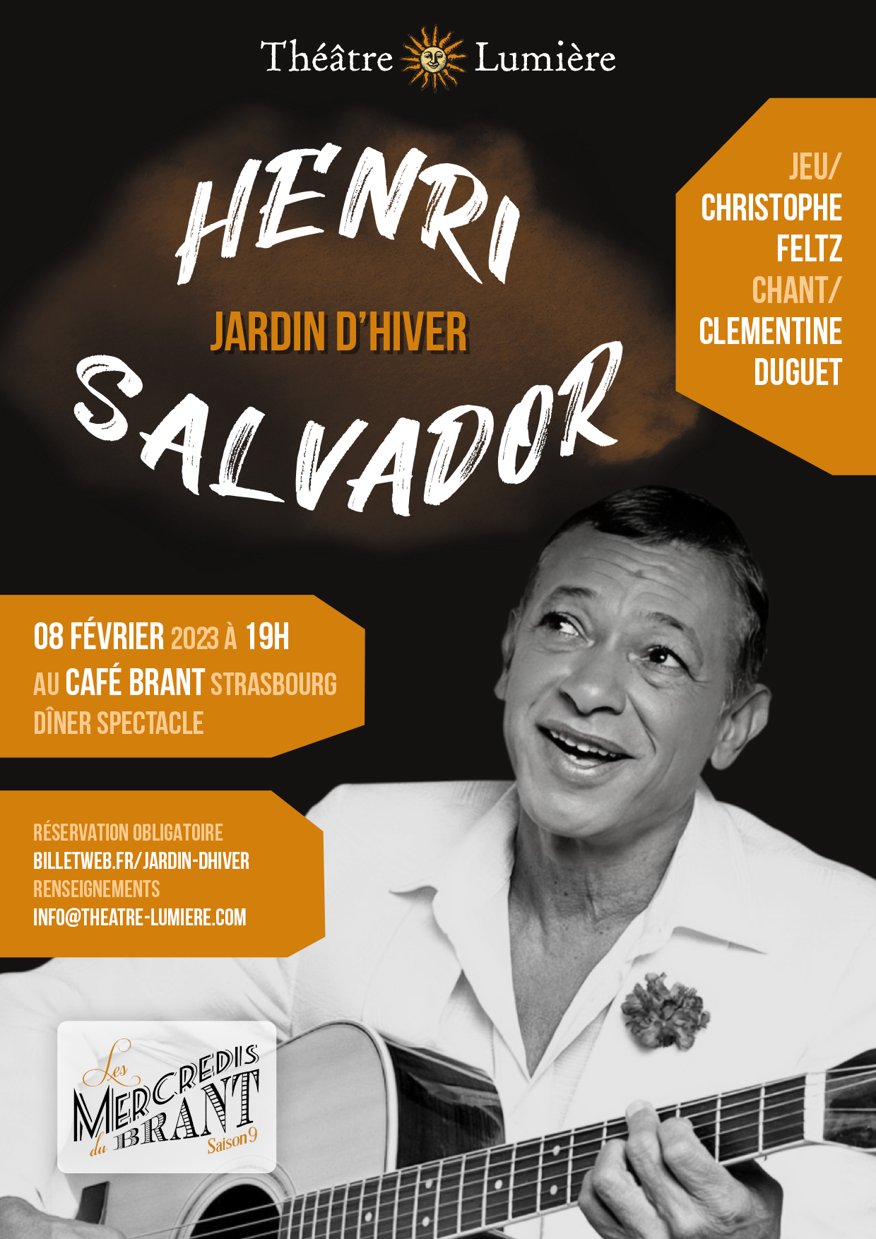 Dîner-spectacle, avec la création de théâtre musical « Jardin d’Hiver »d’après les textes des chansons d’Henri Salvador, en compagnie du comédien Christophe Feltz et de la chanteuse Clémentine Duguet le mercredi 08 février 2023 à 19h au Café Brant à Strasbourg.