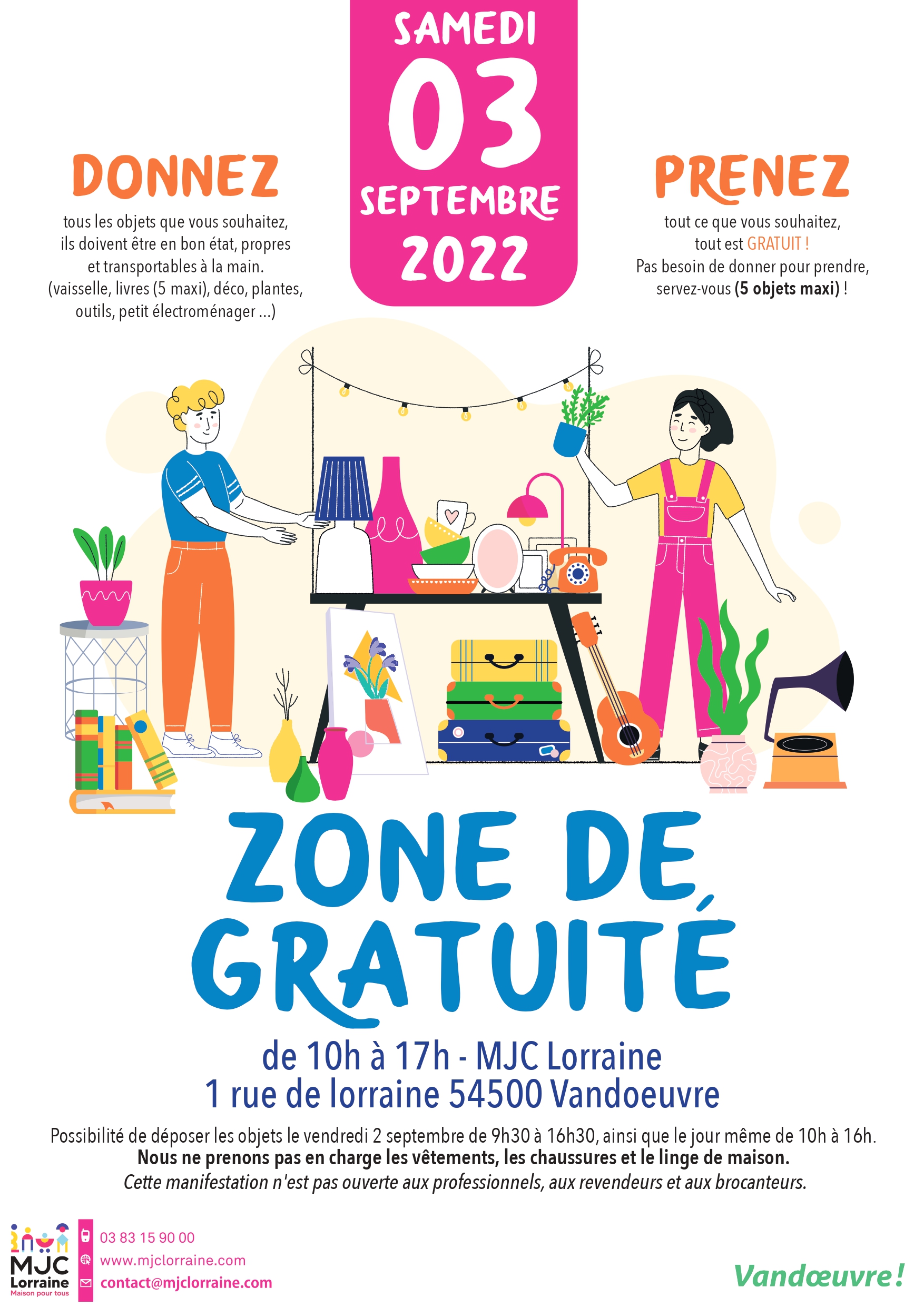 DEPOSEZ vos objets soit le vendredi 2 septembre de 9h30 à 16h30 ou le jour même de 10h à 16h. Cela peut être de la vaisselle, des livres, de la déco, des plantes, des outils, du petit électroménager, de la maroquinerie .... (pas de nourriture, pas de vêtement, pas de chaussure ni de cosmétique). Les objets donnés doivent être en état de marche, propres et transportables à la main.