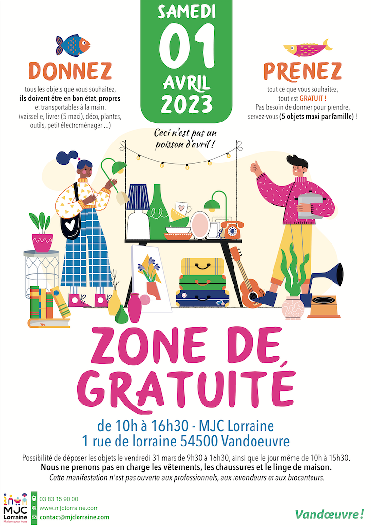 Le samedi 1er avril se tiendra à la MJC Lorraine la zone de gratuité de 10h à 16h30.