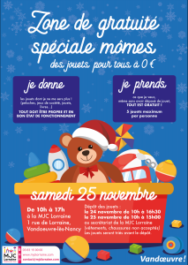 La zone de gratuité spéciale mômes se passera à la MJC Lorraine le samedi 25 novembre de 10h à 17.